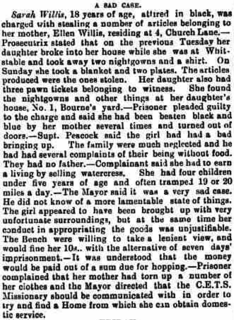 A short piece published in the Canterbury Journal on 27 September covered the previous week’s proceedings at the Canterbury Police Court. The second item was headed ‘A SAD CASE’ and concerned the theft by an 18-year old girl of ‘a number of articles belonging to her mother’. The 18-year old was called Sarah and her mother was Ellen Willis. Sarah had apparently broken into her mother’s house on two occasions and removed various items including two nightgowns, a shirt, a blanket and some plates. Sarah pleaded guilty to the charges.