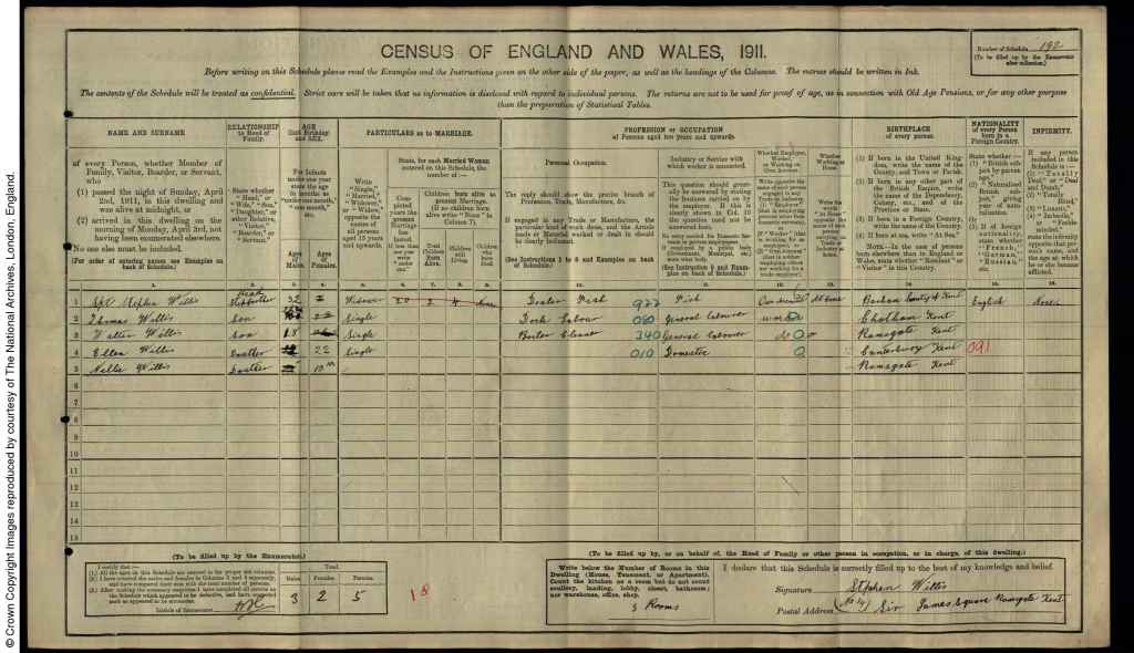 1911 census, 14 ‘Sir’ James Square, Packer’s Lane Ramsgate (actually St James Square)