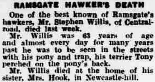 There are still lots of questions to answer and there are lots of stories to tell about other members of the family (for example, the tragic tale of Nellie, who fell off a riverboat and drowned in 1917, a year after her husband had died on the Western Front). Life had always been a struggle for the family but they survived and things seem to have taken a turn for the better after the First World War. And we can be comforted by the knowledge that Stephen junior lived out his final years as a familiar character on the streets of Ramsgate and that his final mention in the Thanet Advertiser had a somewhat more positive tone to it than some of the earlier ones.