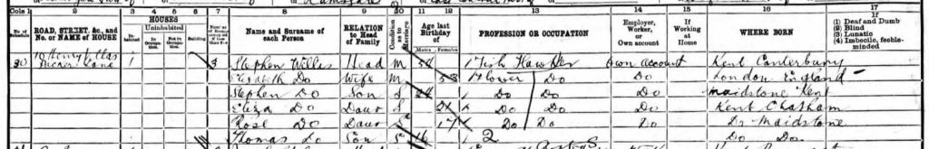 The rest of the family, meanwhile, were still living at 4 Church Lane, Canterbury, where Stephen senior had died the year before. The census entry is quite straightforward. Ellen Willis is listed with her six remaining children; Stephen (15), Eliza (13), Rose (8), Thomas (6), William (4) and Ellen (11 months). The two oldest were already working as hawkers, presumably assisting their mother. The only odd thing about the entry is that Ellen is described as married rather than widowed, but this can probably be put down to a basic error somewhere in the system.