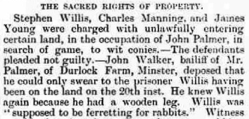 We need to rewind to 1892, and a piece which appeared in the Thanet Advertiser on 3 December, covering proceedings at the recent sitting of the Ramsgate Police Court. The report names three men, Stephen Willis, Charles Manning and James Young, who were charged with poaching on the land of John Palmer of Dunlock Farm in Minster, a few miles from Ramsgate. We get quite a lot of detail regarding the case (Victorian newspapers are such a good source for stuff like this – all human life is there!) but the crucial thing from our point of view is the description of Stephen Willis. John Walker the bailiff at the farm said that he knew Willis ‘because he had a wooden leg’.