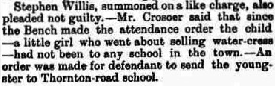 For a start, also in March 1893, Stephen was charged by the school board with failing to send his child to school. The child in question ‘a little girl who went about selling water-cress’ (sound familiar?) apparently hadn’t been to any school in the town. This was probably Rosina who would have been 11 at the time; Stephen had evidently taken on parental responsibility for his late cousin’s children.