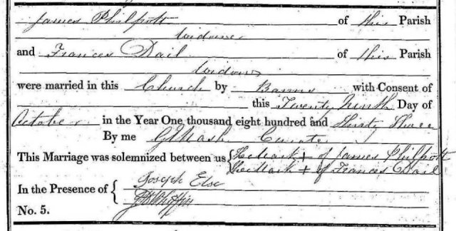 So, when James Philpot married his deceased wife’s sister, Frances, on 29 October 1833, it appeared that there was no serious obstacle to the wedding taking place. James and Frances were married at the parish church of St Mary, Chatham. James was described as a widower and Frances ‘Dail’ as a widow.