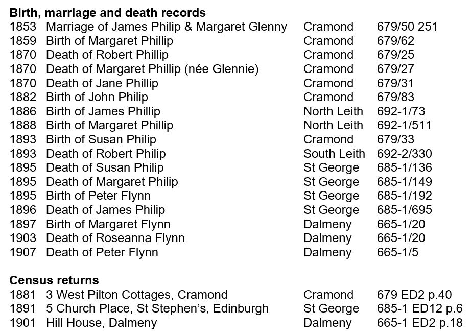 Margaret’s parents, James Philip and Margaret Glennie had married in Cramond on 23 December 1853. They went on to have at least nine children, the oldest two almost certainly born before they were married, and the youngest born in January 1870. Margaret was to die on 16 June 1870, just five months after her youngest child was born; according to the death certificate she had been suffering from typhoid pneumonia for 14 days and from ‘debility’ for a year.