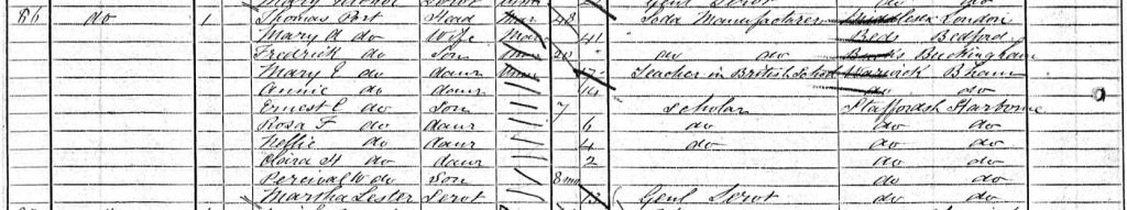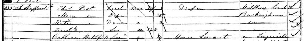 The family at Windmill Lane in 1861 consisted of Thomas, aged 38, a linen draper, his three surviving children – Frederick T, Mary E and Annie – and his sister-in-law, Ann Layton. Ann is listed in the census as a housekeeper and had evidently come up from Buckingham to help Thomas with the children. The household is completed by George L Simmons, an apprentice of Thomas’s and a 13-year old servant called Harriet Beech. Although not stated in the census, George Layton Simmons was also a relative; he was the nephew of Thomas’s late wife, Mary, the son of her sister, Elizabeth.