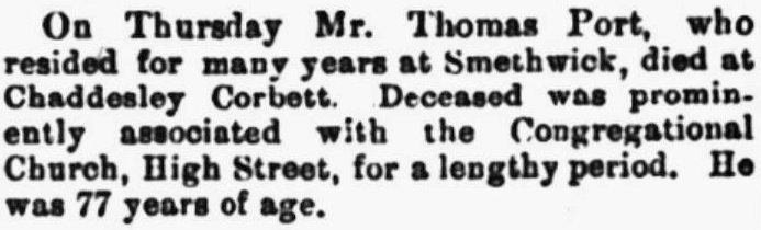 Thomas was to die in Chaddesley Corbett a few years later. The local newspaper, the Smethwick Telephone carried a short piece on 20 January 1900: