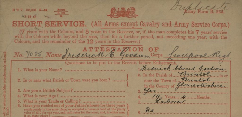 On 14 August 1900, Frederick Edward Goodwin, now aged 19 years and 4 months, enlisted in the Liverpool Regiment, giving his next-of-kin as his father, Edward Goodwin of 27 Middle Bank Street, Stockton-on-Tees. Three months later, on 21 November, after completing his basic training, Frederick was posted from the regimental Depot to join the 2nd Battalion which, at the time the 1901 census was taken (on 1 April), was stationed at the Curragh Camp, 25 miles to the west of Dublin.