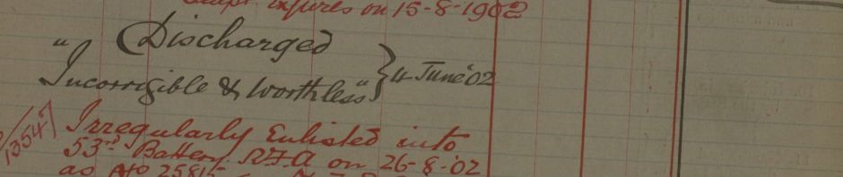 On 4 June 1902, presumably while he was still in prison, Frederick was officially discharged from the Royal Artillery, described by the authorities as ‘Incorrigible & Worthless’.