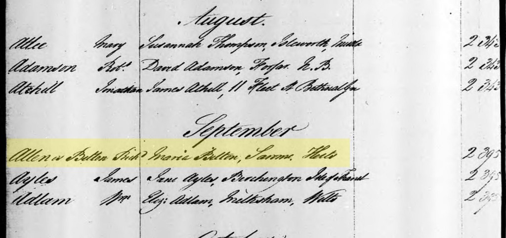 You might have noticed that in the 1812 entry for Richard ALLEN or BILTON (mistranscribed as BETTON in the Findmypast index) his ‘Residence’ was recorded as Sarome, Hertfordshire. (It’s actually Sacome but let’s not worry too much about that.) However, if you look at the entry in the alphabet, you’ll see that, the only residence recorded is that of Maria BILTON, the administrator: Richard’s residence is not recorded.