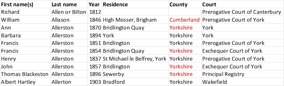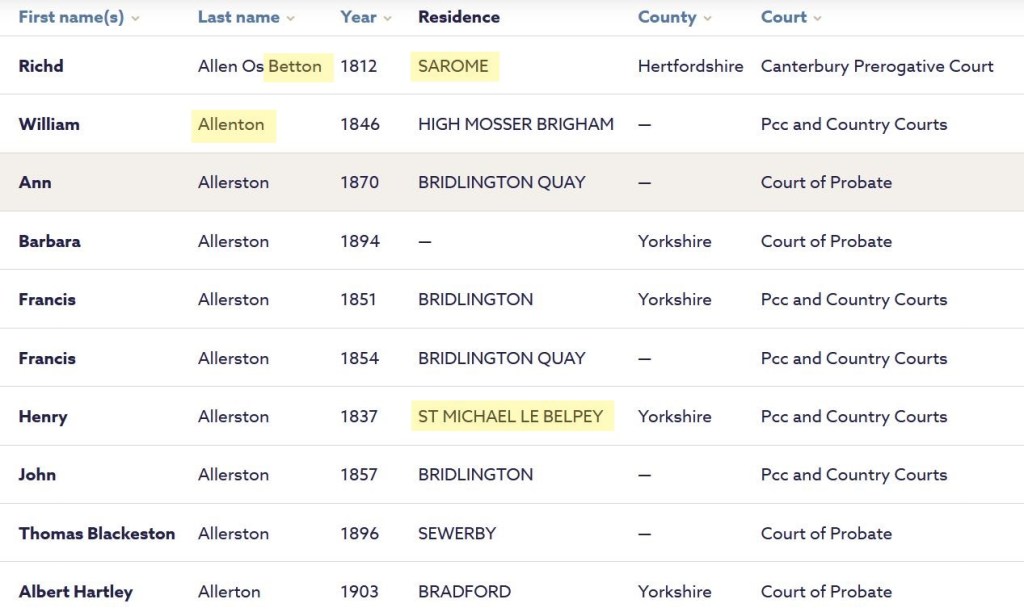 A bit of research will quickly tell us (based on the information in the ‘Residence’ field on the original search) that the other four ALLERSTONs on our original list were also from Yorkshire (this is NOT specified in the original data), but by entering the county that we’re looking for we’re actually eliminating these entries from the results!