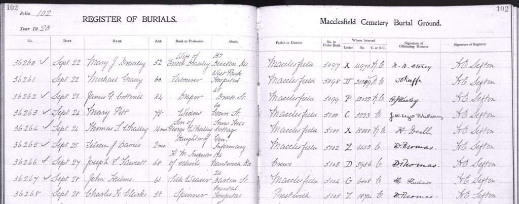 So there we were, standing in Macclesfield Cemetery, in section G, finding names on the stones and looking them up on DeceasedOnline on our phones so that we could find out the plot numbers. Now why didn’t we think of doing that back in 1983!!??