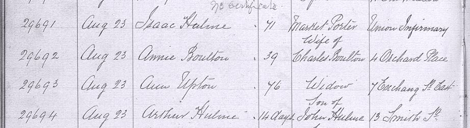 Returning to the Hulme gravestone, and returning to a recurring theme of these blog posts, the dates of death recorded for John and Hannah are wrong. John actually died on 25 September 1926 and Hannah on 5 September 1914. They somehow got them (almost) the wrong way round.