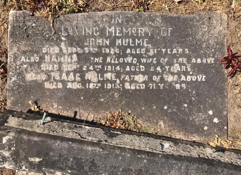 We soon worked out that we were at the wrong end of the plot and gradually worked our way along until we found a grave which we knew, from its plot number, must be very close to the Hulme’s. The area we were in didn’t look too promising: there were very few stones around and those that we could see seemed a bit too recent … but then we turned into a new row, and there it was…