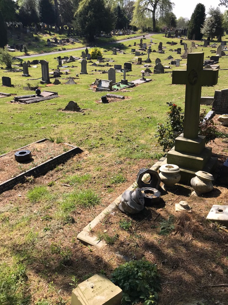 We had two targets to look for – one for the Hulme family and one for the Bullocks – which turned out be in neighbouring sections: G & H. To be honest, we didn’t hold out much hope of finding anything at the Hulme plot. My father-in-law’s paternal grandparents were not particularly well off and it didn’t seem likely that they or any of their children would have been able to afford to have a stone erected. The Bullocks were a (small) step up the social ladder presenting a greater cause for optimism.