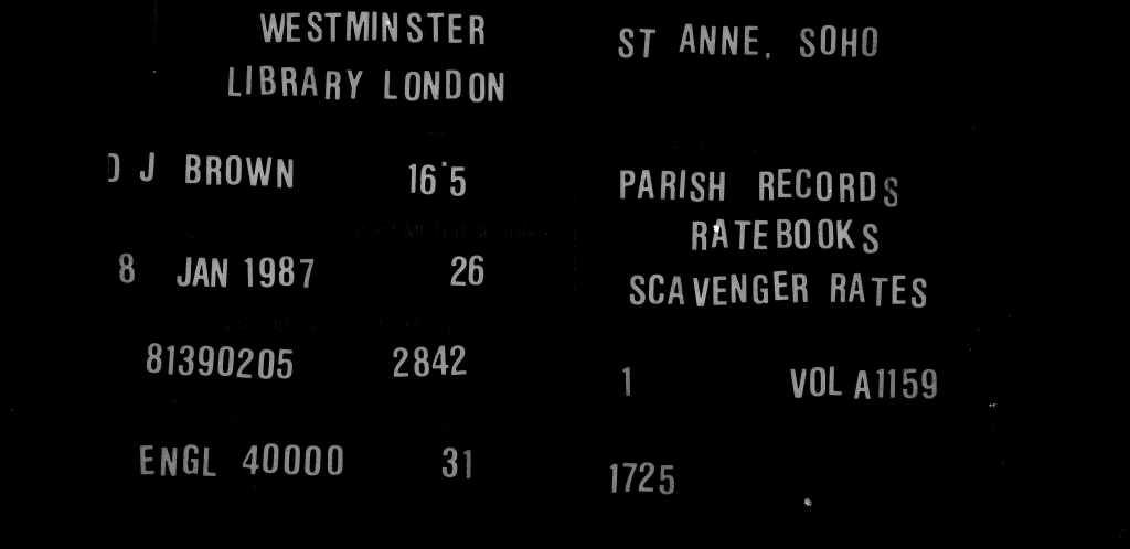 Other than the parish name, there’s really not a lot to be said in defence of the Findmypast results. The year is wrong (it’s clear that what they’ve done is captured the first year of the description of the digital microfilm and applied it to every individual record) falsely suggesting in this case that Benjamin was paying rates in St Anne’ Soho in 1725. The address recorded – ‘North’ – is meaningless; you need to go back a few pages to find out that Benjamin was paying rates on a property on the north side of Compton Street. And we now know that what we’re dealing with here is a Poor Rate book. We also have the archival reference (A114) and we can find the document listed in the City of Westminster Archives’ catalogue and view it in its correct archival context: