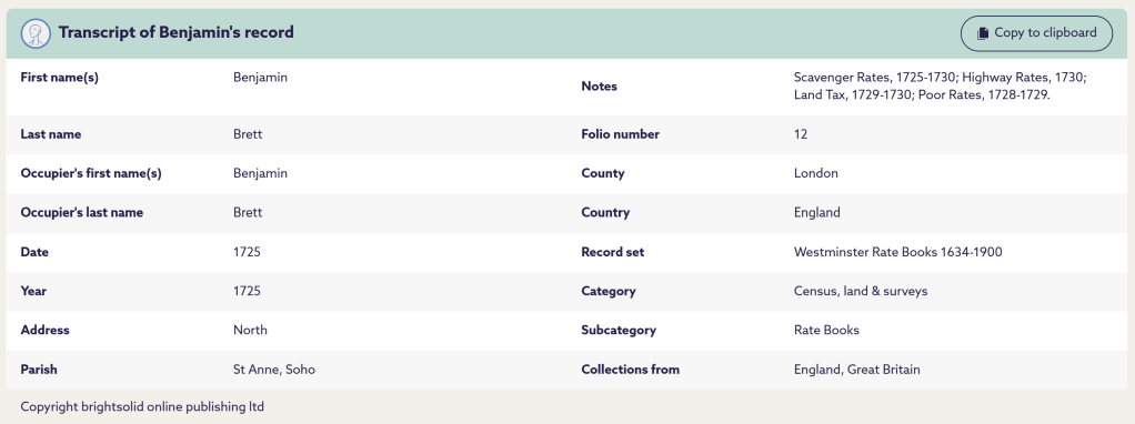 A few weeks ago, I was looking for someone who I knew to have been living in Westminster in the first half of the 18th century and I thought that he was likely to have been a rate payer. So I did a search in the Findmypast database, initially just entering his name – Benjamin Brett. And this is what I got…
