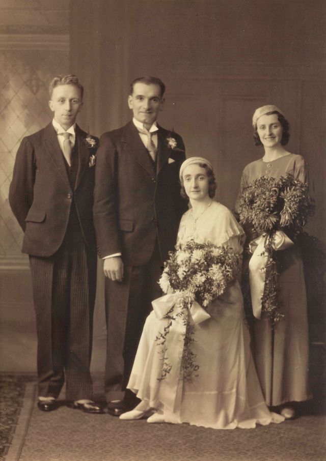 I wasn’t expecting much in the way of old photos – after all, I’d already inherited more than my fair share – but we came across the odd bundle, most of which were copies of ones that I’d seen before. So, when one of my brothers handed me a small pile that he’d just found in the bottom of a drawer, I didn’t hold my breath. The one at the top of the pile was instantly familiar to me; it was a studio portrait of my grandma and grandad on their wedding day (5 September 1931), flanked by the best man (my great uncle John Annal) and the maid of honour, yes, you’ve guessed it, Christine Peace Hope.